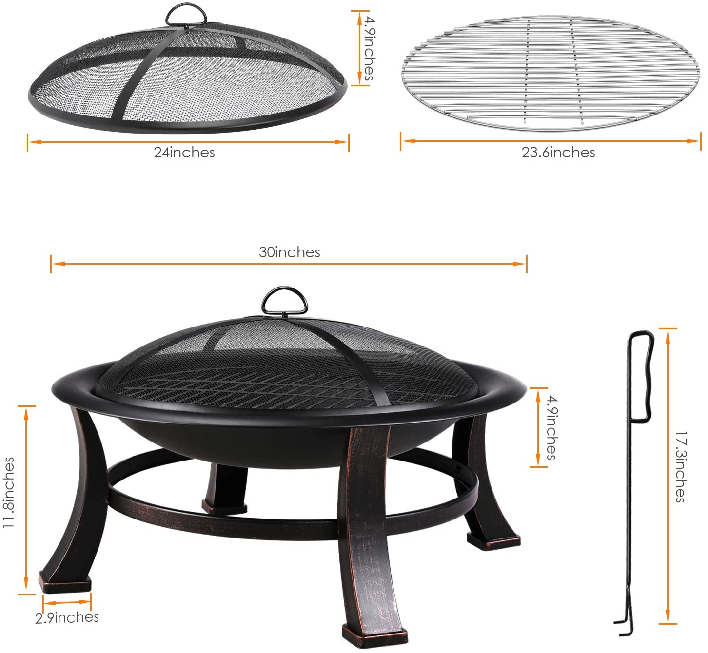 Package Includes: 1 * Fire Bowl 1 * Mesh Screen Cover 1 * 600D Oxford Cover 1 * Barbecue grill 1 * Poker with hook