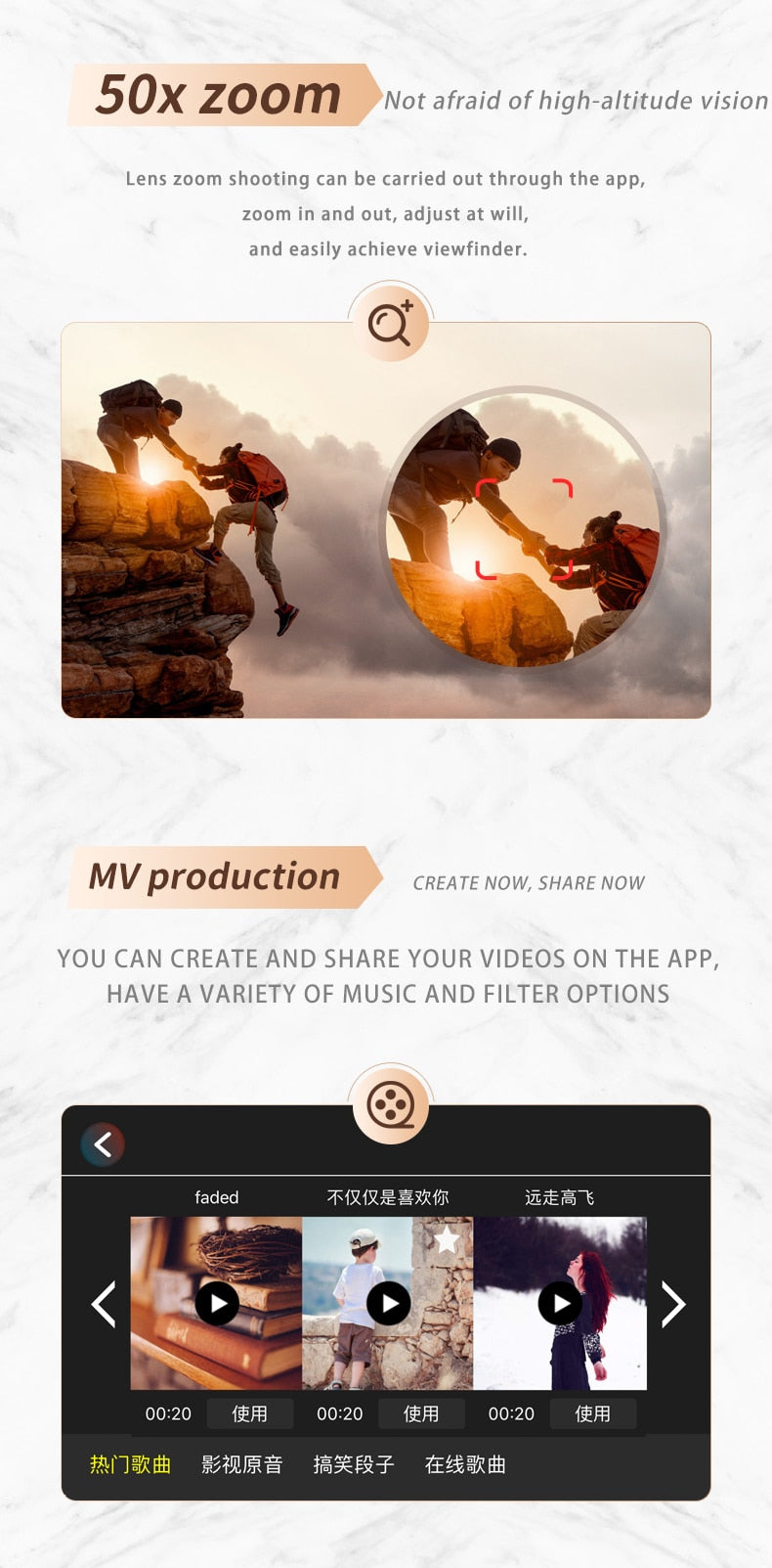 Add music zoom function, dual camera switch, add music zoom function, dual camera function