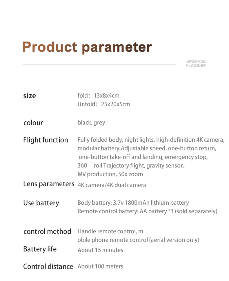 Functions: up/down, forward/backward, left/right, side flight, three-level flight speed, LED lights, headless mode, one-key automatic return, altitude hold mode, WiFi FPV, trajectory flight, Camera/video